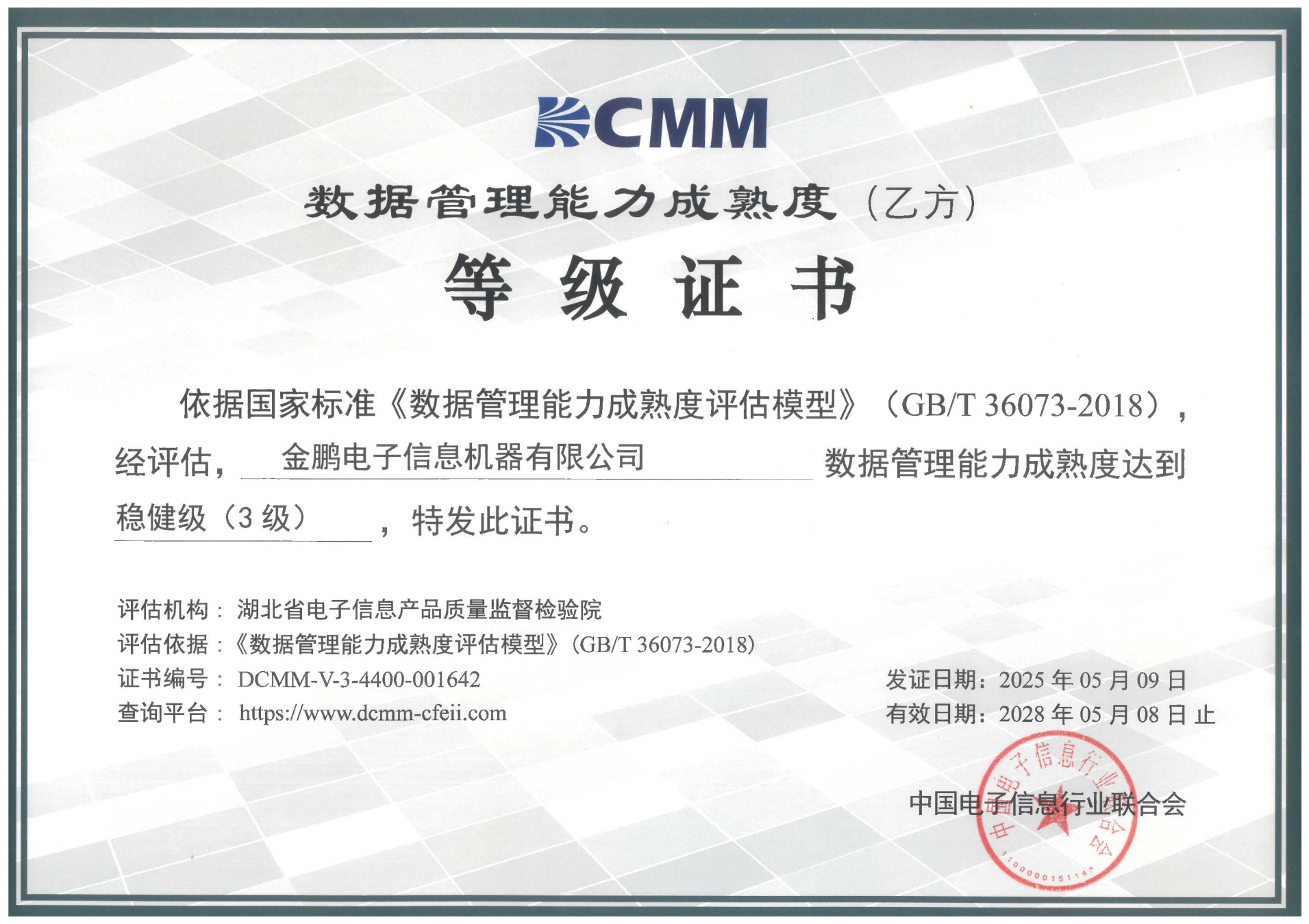 金鵬電子信息機器有限公司通過了數(shù)據(jù)管理能力成熟度評估(Data Management Maturity Model,簡稱DCMM),獲得DCMM穩(wěn)健級證...