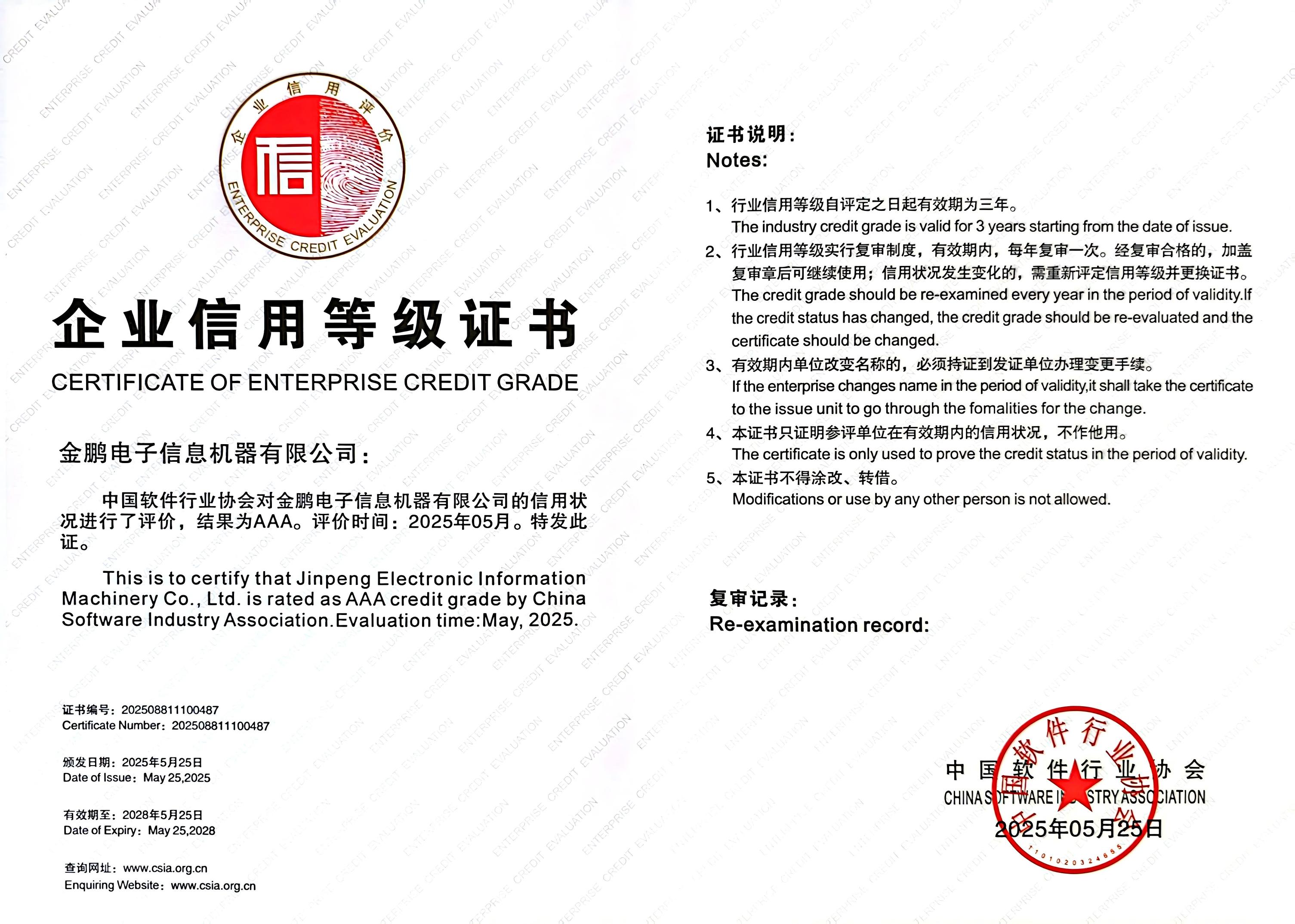 近日,金鵬電子信息機器有限公司通過中國軟件行業(yè)協(xié)會的嚴格審核與認證,再次榮獲“企業(yè)信用AAA等級”證書,這是企業(yè)信用最...