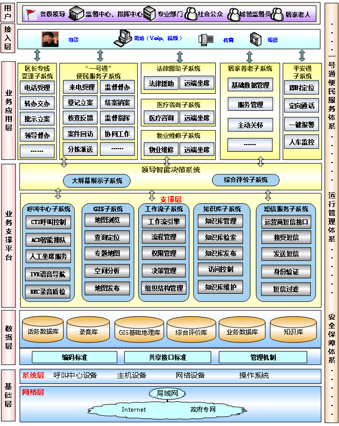 通過公共服務(wù)平臺的建設(shè),逐步形成滿足公共服務(wù)、決策支持、行政監(jiān)督、市場培育需求的“一號通”公共服務(wù)體系,促進(jìn)服務(wù)行業(yè)和社會事業(yè)的快速發(fā)展,逐步將服務(wù)延伸至社會化服務(wù)管理領(lǐng)域,最終在城市化管理地區(qū)的基層社區(qū)推行社會服務(wù)管理,建立并逐步完善“更快地發(fā)現(xiàn)問題、更好地處置問題、更有效地解決問題”的工作架構(gòu)和運(yùn)行機(jī)制,形成“精細(xì)化管理、人性化服務(wù)、多元化參與、信息化支撐”的社會服務(wù)管理新模式,使之成為社會管理的有效載體,成為社會管理創(chuàng)新的品牌,全面提升社會服務(wù)管理工作水平。