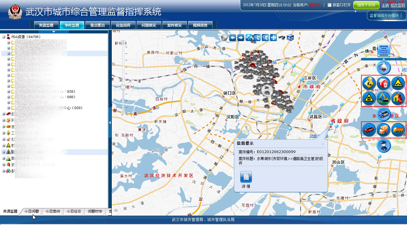 武漢市數(shù)字化城市綜合管理系統(tǒng)是根據(jù)武漢市數(shù)字城管建設(shè)的實際需求,充分整合城市管理的視頻、移動巡查、車輛、重點設(shè)施等城管資源數(shù)據(jù)和現(xiàn)有應(yīng)用系統(tǒng),通過改造和完善現(xiàn)有的城管案件處置流程,將城市綜合管理的巡查發(fā)現(xiàn)、投訴受理、協(xié)調(diào)督辦、檢查考評、設(shè)施監(jiān)控、指揮調(diào)度等工作納入系統(tǒng)管理,構(gòu)筑市、區(qū)及各職能部門共享的一體化城市綜合管理監(jiān)督、考核和指揮調(diào)度體系,建立日常控管與應(yīng)急指揮有機結(jié)合的城市綜合管理信息化處理機制。