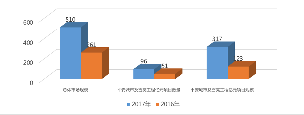 據(jù)金鵬監(jiān)測到的大項(xiàng)目數(shù)據(jù)顯示,截止2017年12月底,我國城市視頻監(jiān)控市場中標(biāo)的大項(xiàng)目累計(jì)有1049個,總市場規(guī)模達(dá)510億元,較2016年市場規(guī)模增長95%。其中包含平安城市和雪亮工程在內(nèi)的中標(biāo)過億元項(xiàng)目有96個,累計(jì)市場規(guī)模約317億元;2016年包含平安城市和雪亮工程在內(nèi)的中標(biāo)過億元項(xiàng)目有51項(xiàng),累計(jì)市場規(guī)模約123億元。2017年項(xiàng)目數(shù)量較2016年增長88%,市場規(guī)模增長158%。其中涉及雪亮工程市場規(guī)模約有的中標(biāo)億元項(xiàng)目9個,累計(jì)市場規(guī)模約32億元。(PS:大項(xiàng)目是指中標(biāo)金額≧500萬元的項(xiàng)目)
