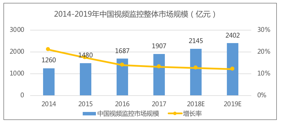 自1996年公安部提出“科技強(qiáng)警”到現(xiàn)在,國內(nèi)平安城市建設(shè)之路已走過20年有余。“科技強(qiáng)警”戰(zhàn)略實(shí)施以及“3111”試點(diǎn)工程、雪亮工程戰(zhàn)略,將中國城市視頻監(jiān)控建設(shè)的熱潮迅速由試點(diǎn)區(qū)域延伸至全國,由公安主導(dǎo)延伸到各部委、各行業(yè)主管部門都積極重視。目前,我國城市視頻監(jiān)控建設(shè)仍處于全面建設(shè)階段,各省市先后推出眾多針對(duì)平安城市、雪亮工程等的安防建設(shè)項(xiàng)目,大大拉動(dòng)了安防產(chǎn)業(yè)的發(fā)展。根據(jù)前瞻產(chǎn)業(yè)研究院數(shù)據(jù),2016年安防行業(yè)總產(chǎn)值已達(dá)到5,400億元,同比增長(zhǎng)11%,預(yù)計(jì)2017年市場(chǎng)規(guī)模達(dá)5,958億元。按照《中國安防行業(yè)“十三五”(2016-2020年)發(fā)展規(guī)劃》,“十三五”期間,中國安防行業(yè)將向規(guī)?;⒙?lián)網(wǎng)化、自動(dòng)化、智能化轉(zhuǎn)型升級(jí),預(yù)計(jì)到2020年,安防行業(yè)總產(chǎn)值將達(dá)到8,000億元,年增長(zhǎng)率超過10%。單是視頻監(jiān)控每年的市場(chǎng)規(guī)模也不容小窺,如下圖,2017年視頻監(jiān)控整體的市場(chǎng)規(guī)模1,907億元,預(yù)計(jì)2018年將達(dá)到2,145億元。安防項(xiàng)目建設(shè)作為智慧城市建設(shè)的重要組成部分,將為智慧城市發(fā)展打下堅(jiān)實(shí)的基礎(chǔ),而智慧城市的興起對(duì)安防行業(yè)也將起到助推作用。