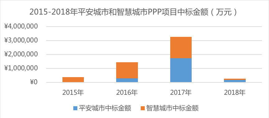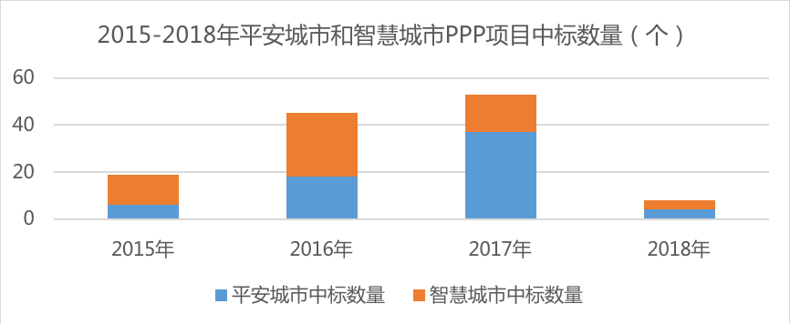 從以上兩張圖片數(shù)據(jù)可以看出:從數(shù)量上來看2017年平安城市項(xiàng)目比智慧城市類項(xiàng)目多,從中標(biāo)金額來看,平安城市也比智慧城市略多一些。(2018年數(shù)據(jù)截止2018年2月底)。所以說平安城市是智慧城市建設(shè)的重要組成部分,也是PPP模式的重要應(yīng)用場(chǎng)景。