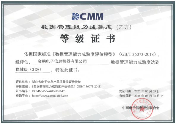 近日,金鵬電子信息機器有限公司通過了數(shù)據(jù)管理能力成熟度評估(Data Management Maturity Model,簡稱DCMM),獲得DCMM穩(wěn)健級證書,標志著公司在數(shù)據(jù)管理領域的綜合實力得到了國家級權威機構的認可。