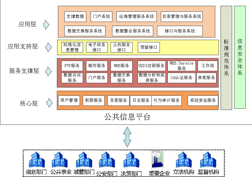 公共信息平臺的數(shù)據(jù)來源于城管、公安、規(guī)劃、應(yīng)急等政府部門以及重要企業(yè)的數(shù)據(jù)庫。核心層通過用戶管理、權(quán)限服務(wù)、目錄服務(wù)等方式管理數(shù)據(jù),確保數(shù)據(jù)的有效性。利用數(shù)據(jù)訪問服務(wù)、數(shù)據(jù)交換服務(wù)、數(shù)據(jù)分析和報表服務(wù)、CA認證服務(wù)等,服務(wù)支撐層對數(shù)據(jù)進行數(shù)據(jù)比對、清洗、轉(zhuǎn)換、異常處理,并通過應(yīng)用支持層提供的訪問各類信息資源接口,為上層應(yīng)用層的支撐數(shù)據(jù)、門戶系統(tǒng)、運維管理服務(wù)系統(tǒng)、目錄管理與服務(wù)系統(tǒng)、數(shù)據(jù)交換服務(wù)系統(tǒng)、數(shù)據(jù)整合服務(wù)系統(tǒng)、接口與服務(wù)系統(tǒng)提供信息接口服務(wù)。經(jīng)過處理后的數(shù)據(jù)將應(yīng)用層進行展現(xiàn),政府部門、企業(yè)以及個人可獲取不同的政務(wù)信息,從而實現(xiàn)政務(wù)信息共享。