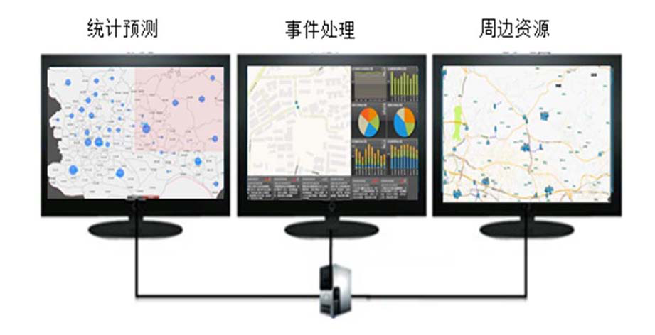 采用三屏的模式,分別展示統(tǒng)計預(yù)測系統(tǒng),事件處理系統(tǒng)以及周邊資源系統(tǒng),共同為城管事件處理過程服務(wù)。以城市公共安全資源為載體,依托空間信息、業(yè)務(wù)信息共享平臺和傳感器網(wǎng)絡(luò),構(gòu)建城市應(yīng)急指揮、現(xiàn)場處置、預(yù)防預(yù)警的城市安全防護體系,實現(xiàn)智能化安全管理、傳感器自動報警、快速反應(yīng)及智能輔助決策等。