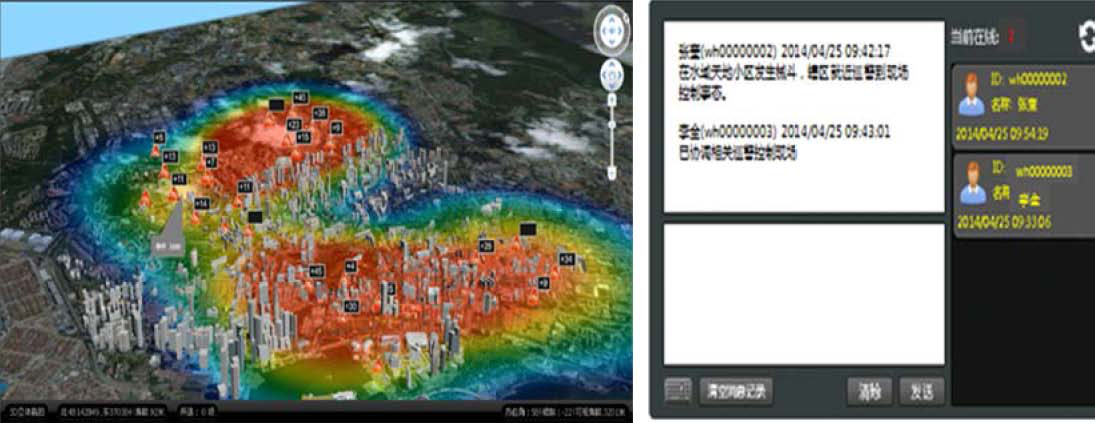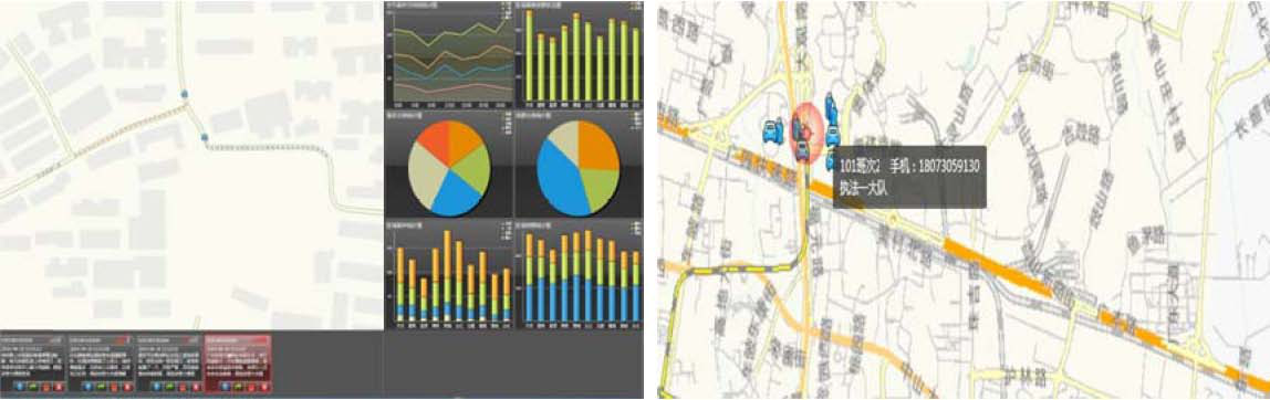 通過與城管執(zhí)法系統(tǒng)進行交互,實現(xiàn)電話上報、案發(fā)地址等定位方式,把相關(guān)信息展現(xiàn)在地圖上,同時顯示周邊視頻探頭、執(zhí)法隊員、城管車輛、卡口等資源分布情況和其他信息,幫助指揮人員了解現(xiàn)場動態(tài)以輔助決策。大屏幕左側(cè)為現(xiàn)場情況右側(cè)為快速定位系統(tǒng)。