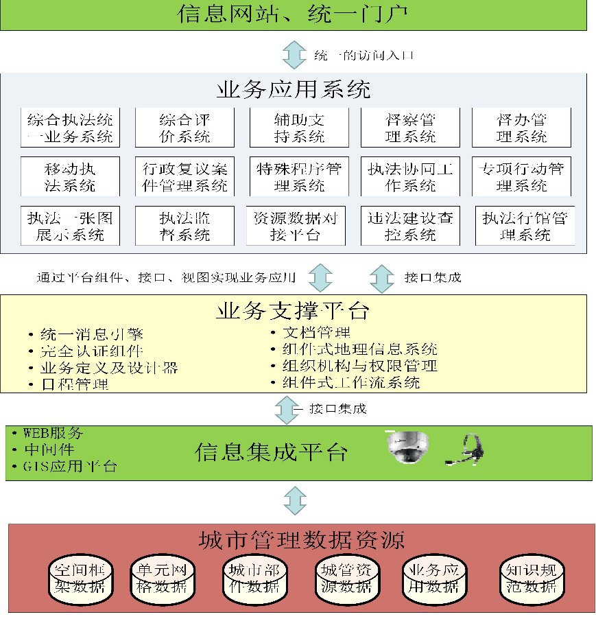 通過整合空間框架、單元網(wǎng)格、城市部件、城管資源、業(yè)務(wù)應(yīng)用、知識規(guī)范數(shù)據(jù),利用 WEB服務(wù)、中間件、GIS服務(wù),構(gòu)建統(tǒng)一消息引擎、完全認證組件、統(tǒng)一的業(yè)務(wù)定義及設(shè)計器、文檔管理、組件式工作流等基礎(chǔ)支撐應(yīng)用。充分利用平臺的基礎(chǔ)功能,建立綜合執(zhí)法統(tǒng)一業(yè)務(wù)系統(tǒng)、綜合評價系統(tǒng)、輔助支持系統(tǒng)、督察管理系統(tǒng)、督辦管理系統(tǒng)、移動執(zhí)法系統(tǒng)等一系列應(yīng)用。