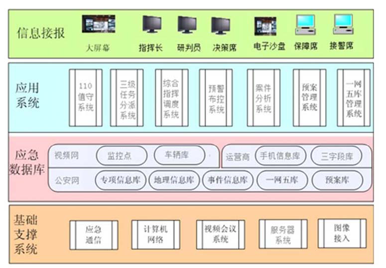 結(jié)合公安業(yè)務(wù)的需求特點,構(gòu)建了公安決策指揮調(diào)度系統(tǒng)四層結(jié)構(gòu):支撐層、物理層、業(yè)務(wù)層和發(fā)布層。支撐層通過建設(shè)應(yīng)急通信系統(tǒng)、計算機網(wǎng)絡(luò)系統(tǒng)、視頻會議系統(tǒng)、圖像接入系統(tǒng),為公安決策指揮調(diào)度系統(tǒng)提供底層服務(wù)。物理層主要是跨系統(tǒng)整合各種資源存儲系統(tǒng),提供業(yè)務(wù)所需的各種信息資源。業(yè)務(wù)層是在物理層的基礎(chǔ)上把各種資源進行整合,統(tǒng)一調(diào)度封裝,處理公安業(yè)務(wù),根據(jù)需求動態(tài)配置服務(wù),并提供標準的訪問接口。邏輯層主要包括 110值守系統(tǒng)、三級任務(wù)分派系統(tǒng)、綜合指揮調(diào)度系統(tǒng)、預(yù)警布控系統(tǒng)、案件分分析系統(tǒng)、預(yù)案管理系統(tǒng)、一網(wǎng)五庫管理系統(tǒng)等。用戶將利用發(fā)布層的大屏幕、指揮席、研判席、研判席、電子沙盤、保障席、接警席等方式來發(fā)布公安信息,從而進行指揮調(diào)度。